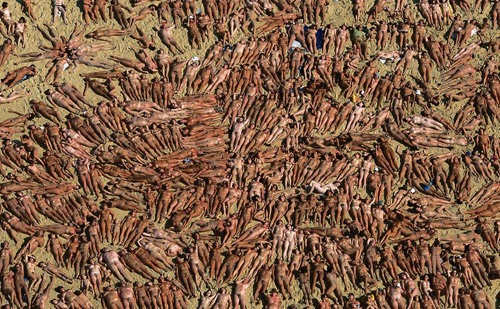 The picture above is of 500-or-so nude sunbathers, from a global aerial photographic survey conducted by Yann Arthus-Bertrand and a team of editors, technicians, translators, etc. Started in 1994, the project is called The Earth From Above, and “was born from Yab’s dream for a general survey on the state of the Earth at the eve of the 21st century”.