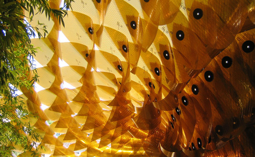 During my visit to LA this summer, I made a trip out to M&A to see Benjamin Ball and Gaston Nogues’s sculptural/architectural rendition of a black hole: Maximilan’s Schell. The piece is named after the actor by the same name who played ‘Dr. Reinhardt’ in the Disney sci-fi thriller, (you guessed it), The Black Hole. Bails of hay underneath the structure served as a welcome place to seek refuge from the blazing LA sun/atomsphere, as the golden mylar filters out a nice chunk of the ultraviolet spectrum, creating an oasis of cool. After my rest I took some pictures (which just got props on Cool Hunting) and shot some low quality video with my digital camera.
