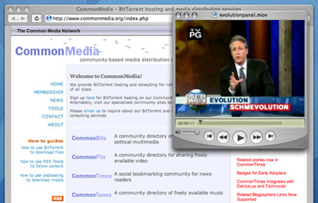 CommonBits provides downloadable political media, including regular Daily Show excerpts (no worries, Jon Stewart says it’s cool). CommonFlix and CommonTunes collect freely available music and video and organize it by category, popularity, and age. Much of this content is distributed via BitTorrent, which provides for efficient, decentralized file sharing.