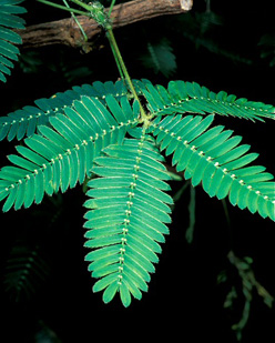 Mimosa: three parts champagne to two parts orange juice; or, a genus of herbs and shrubs that includes the species Mimosa pudica, also known as the ‘Sensitive plant’ or 'Sleeping grass’. 'Pudica’ is Latin for 'bashful’ or 'shrinking’ – in Chinese, the name translates to 'shyness grass’. When leaves are touched or subjected to rapid temperature changes, electrical signals are triggered that travel up the midvein, contracting each leaflet along the way. This type of response is known as nastic or nyctinastic movement. The following videos are in real-time – notice how with a stronger stimuli, the signal is redistributed to the rest of the leaf once it reaches the stem.