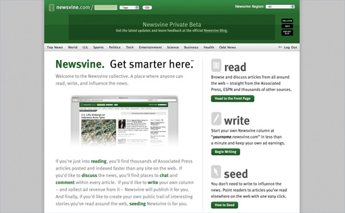 Newsvine is a new social news aggregator which combines live Associated Press content and user submitted articles. It’s in a similar vein as CommonTimes [previously] and digg, with all kinds of extra functionality like the ability to view your news submissions as a column, and earn revenue from ads on your column page (ads will be added once Newsvine goes public).