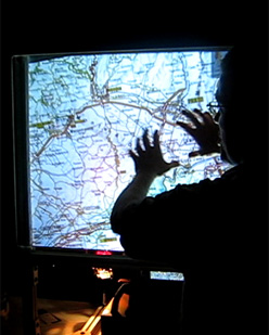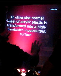 The last post on multi-touch interaction reminded me of the Touchlight interface I saw at last year’s SIGGRAPH. Here’s some video I took of its creator, Andrew Wilson, explaining a prototype, and an earlier clip of him outlining the workings in more detail.