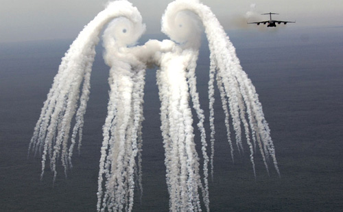 Flares released by this C-17 Globemaster III form a pattern sometimes referred to as a “smoke angel”, caused by wingtip vorticies spiraling in the aircraft’s wake.