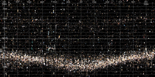 His latest takes 40,000 photos tagged “sunset” last year, each positioned horizontally according to the day taken, and vertically according to the hour. You can watch the year progress as the summer and winter solstices fade back and forth. Grab the full res version or you’re only kidding yourself.
