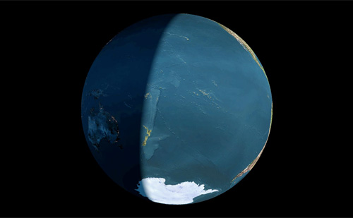 the Earth pretending to be an ocean planet, time of posting simulated via The Living Earth, © Earth Imaging
