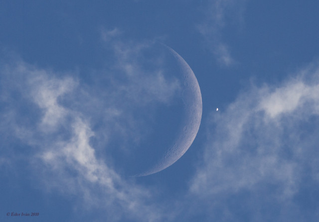 These photos containing both the Moon and Venus were captured by Hungarian astrophotographer Iván Éder in 2007(above) and 2004 (below). There’s much more of Éder’s astrophotography on his site, as well as a gallery of his impressive collection of custom astrographs (astrophotography telescopes).