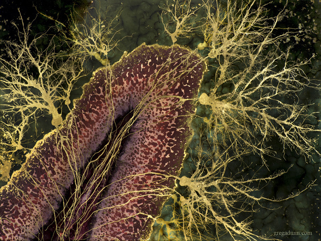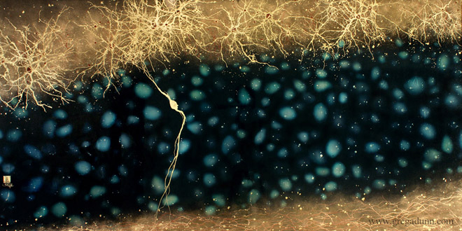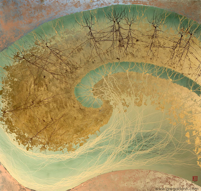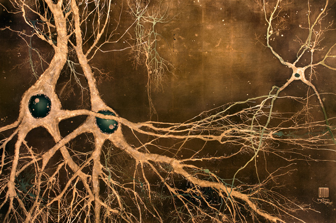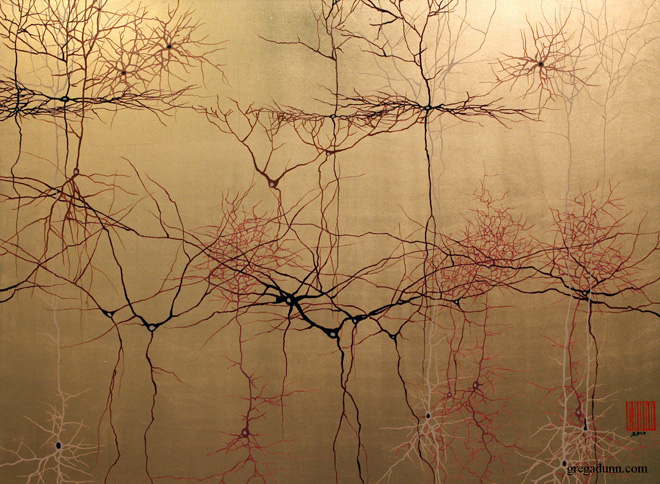 Now a full-time artist living in Philadelphia, Dunn says he was inspired in his grad-student days by the spare beauty of neurons treated with certain stains. The Golgi stain, for example, will turn one or two neurons black against a golden background. ”It has this Zen quality to it that really appealed to me,” Dunn said.