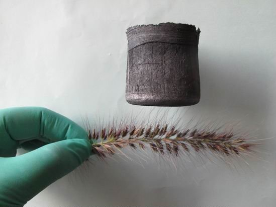 A piece of carbon aerogel balanced on a flower at zhejiang university in hangzhou, china. Made of freeze-dried carbon nanotubes and graphene oxide with the oxygen then chemically removed, it is the lightest solid material in the world.