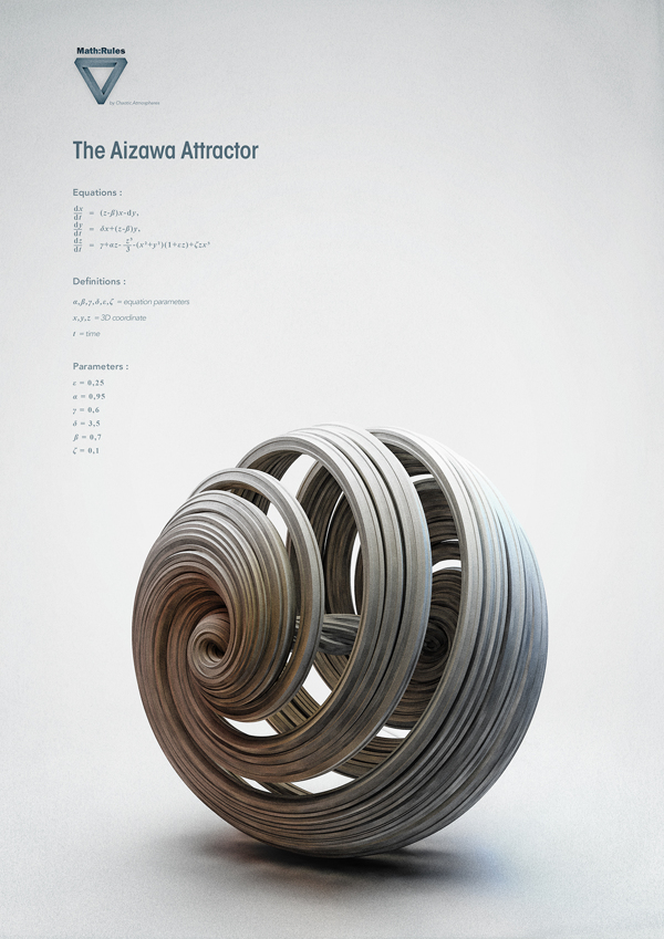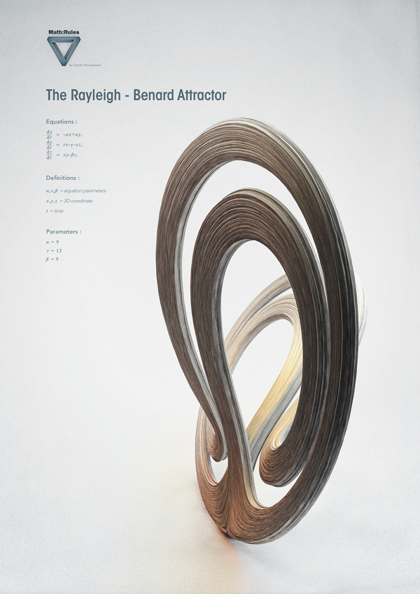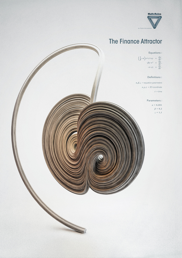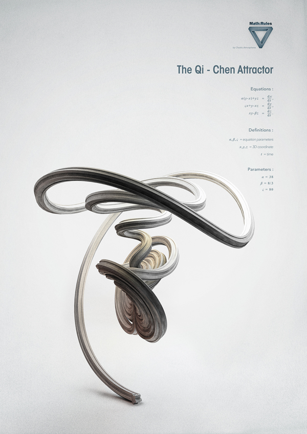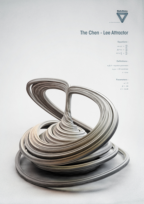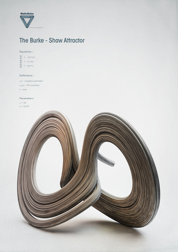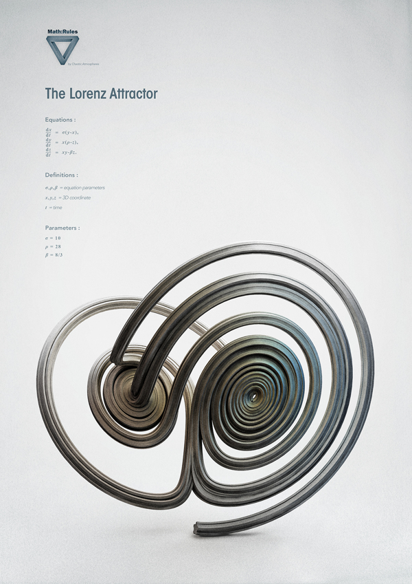 The darkest art known as Chaos Theory is perfectly embodied in the form of its strange attractors: vast looping trajectories of variables that, when plotted, conjure gorgeous yet insidiously disruptive patterns. Chaotic Atmosphere’s Math: Rules series pays tribute to the beautiful form of chaos and its inevitable collapse of all our efforts to predict it.