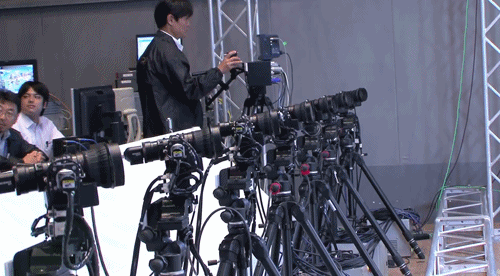 This multi-viewpoint robotic camera system, under development by NHK, links the motion of eight sub-cameras to that of an individual camera, so that all the cameras film the same moving object.