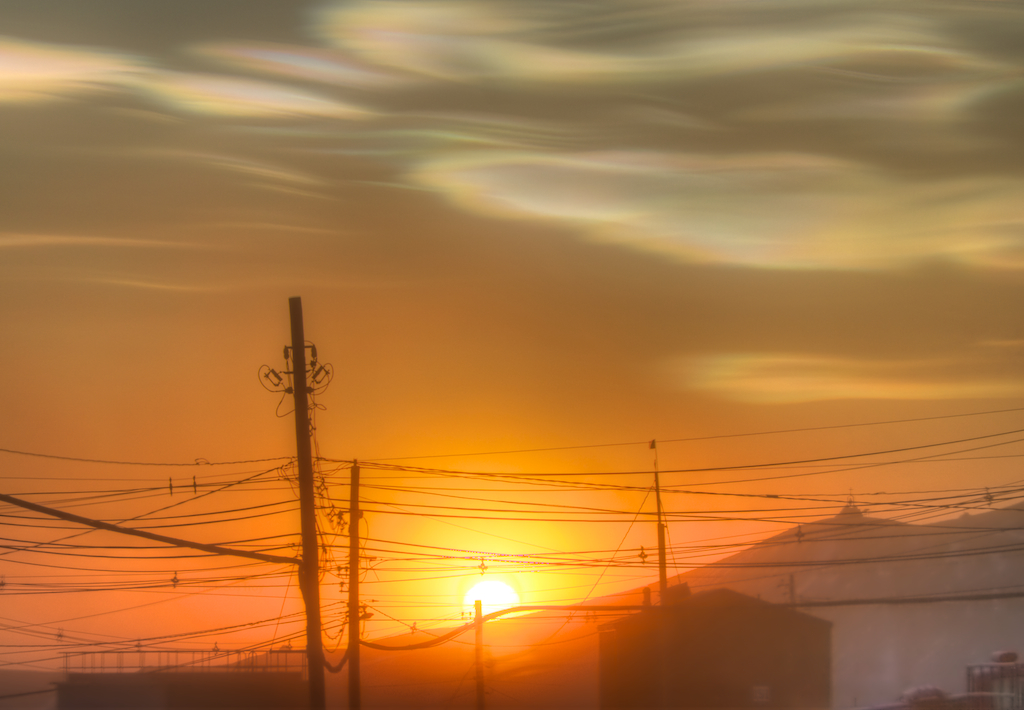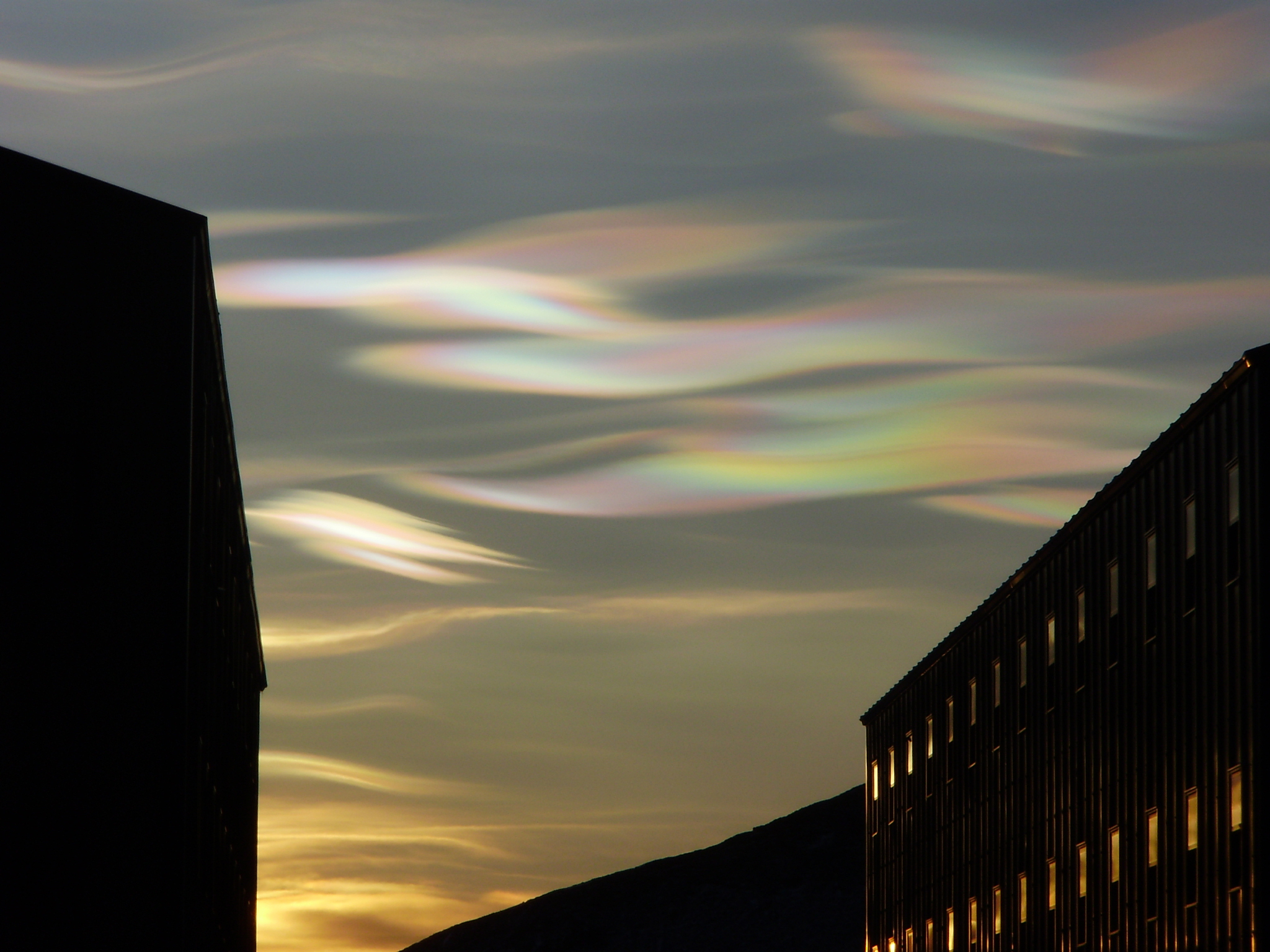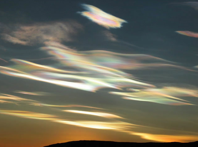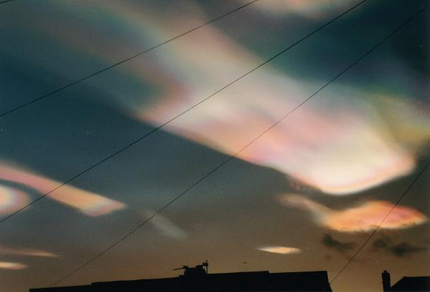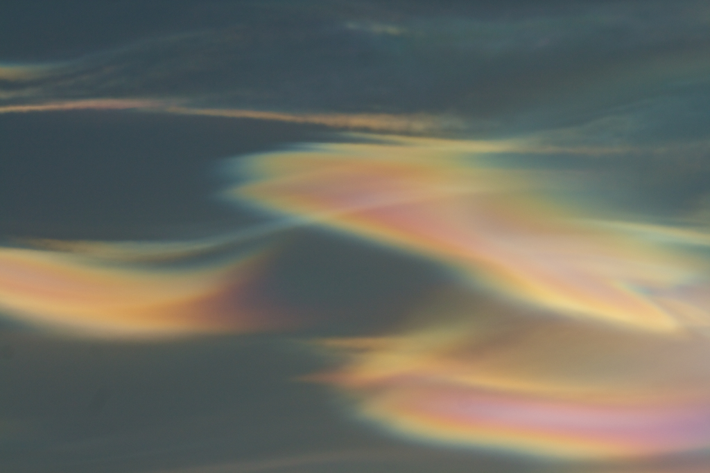 Nacreous clouds, sometimes called mother-of-pearl clouds, are rare but once seen are never forgotten. They are mostly visible within two hours after sunset or before dawn when they blaze unbelievably bright with vivid and slowly shifting iridescent colours. They are filmy sheets slowly curling and uncurling, stretching and contracting in the semi-dark sky. Compared with dark scudding low altitude clouds that might be present, nacreous clouds stand majestically in almost the same place - an indicator of their great height.
