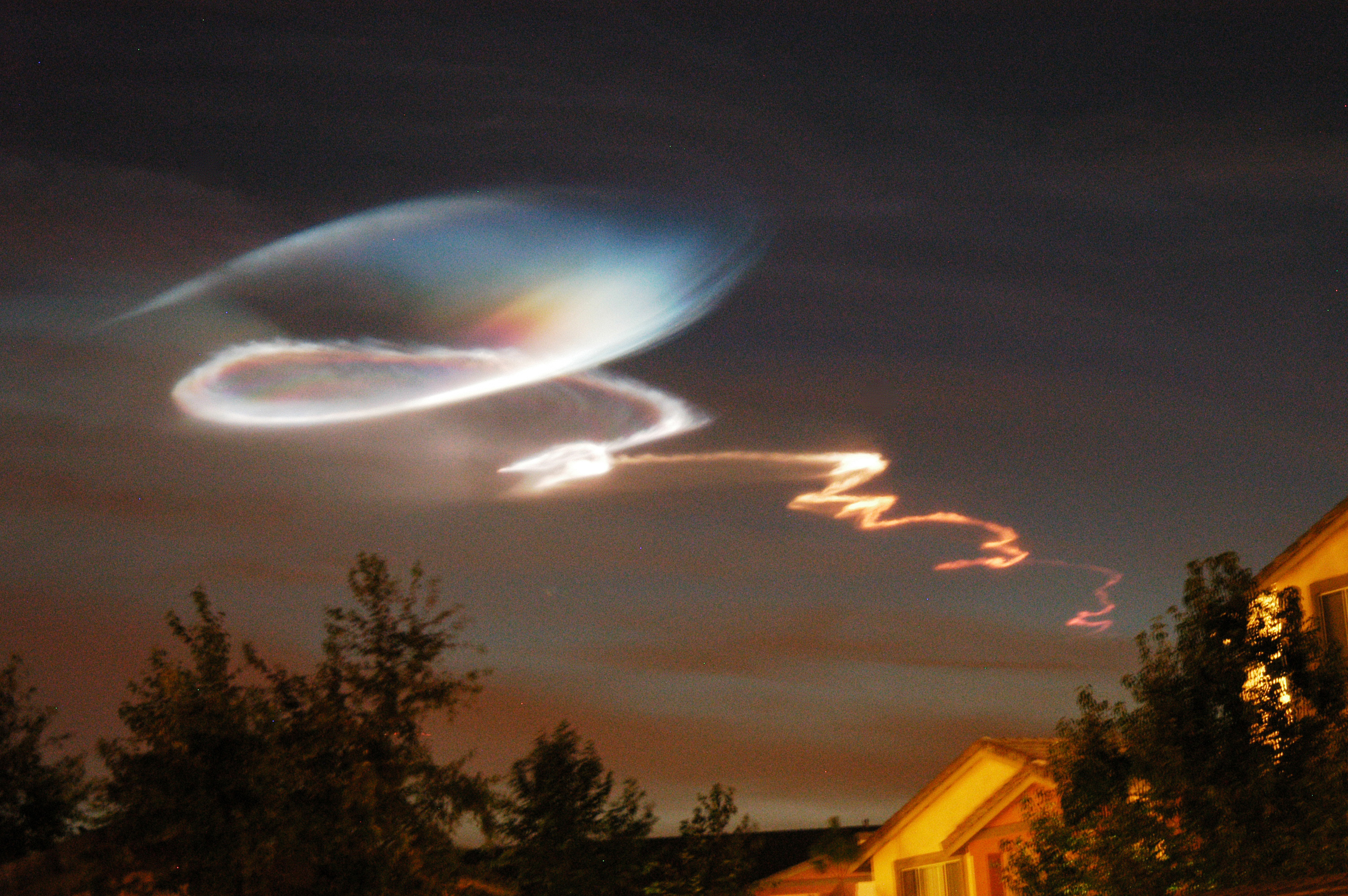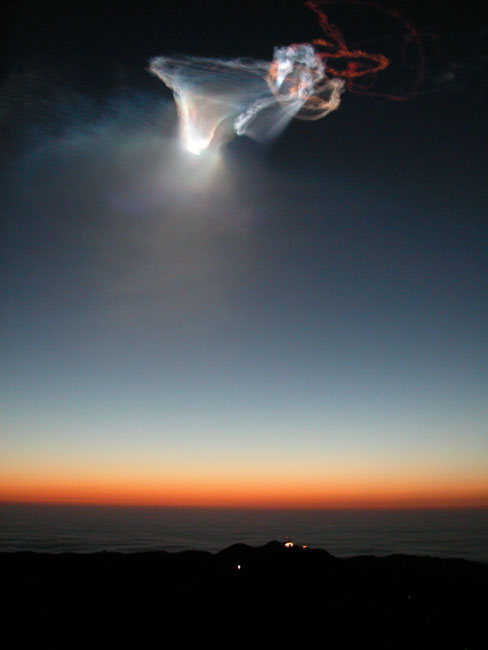 This phenomenon usually produces a cloud of green, blue, white and rose colored hues which takes on a corkscrew appearance as it is whipped around by wind currents. It is seen within two to three minutes after a launch has occurred. Depending on weather conditions, it could remain in the sky for up to half an hour before dispersing.