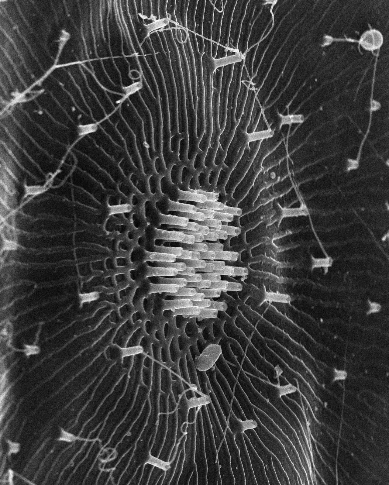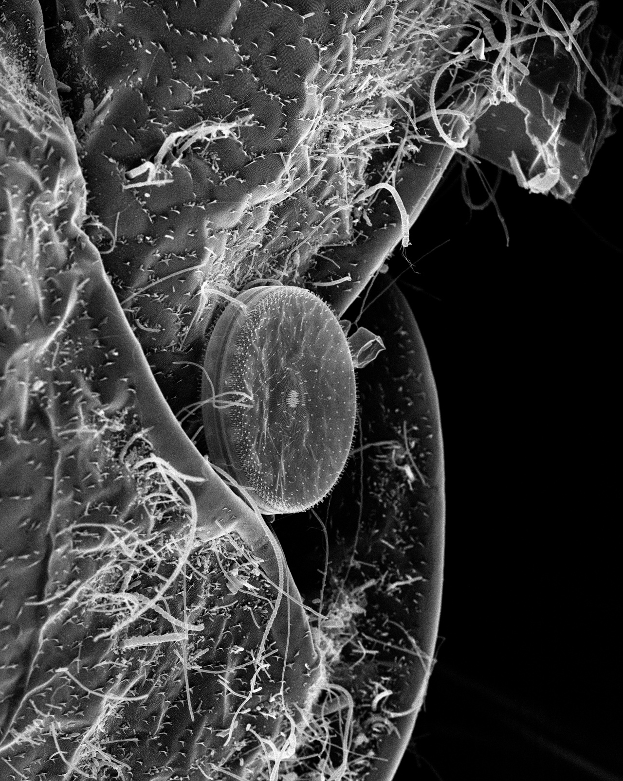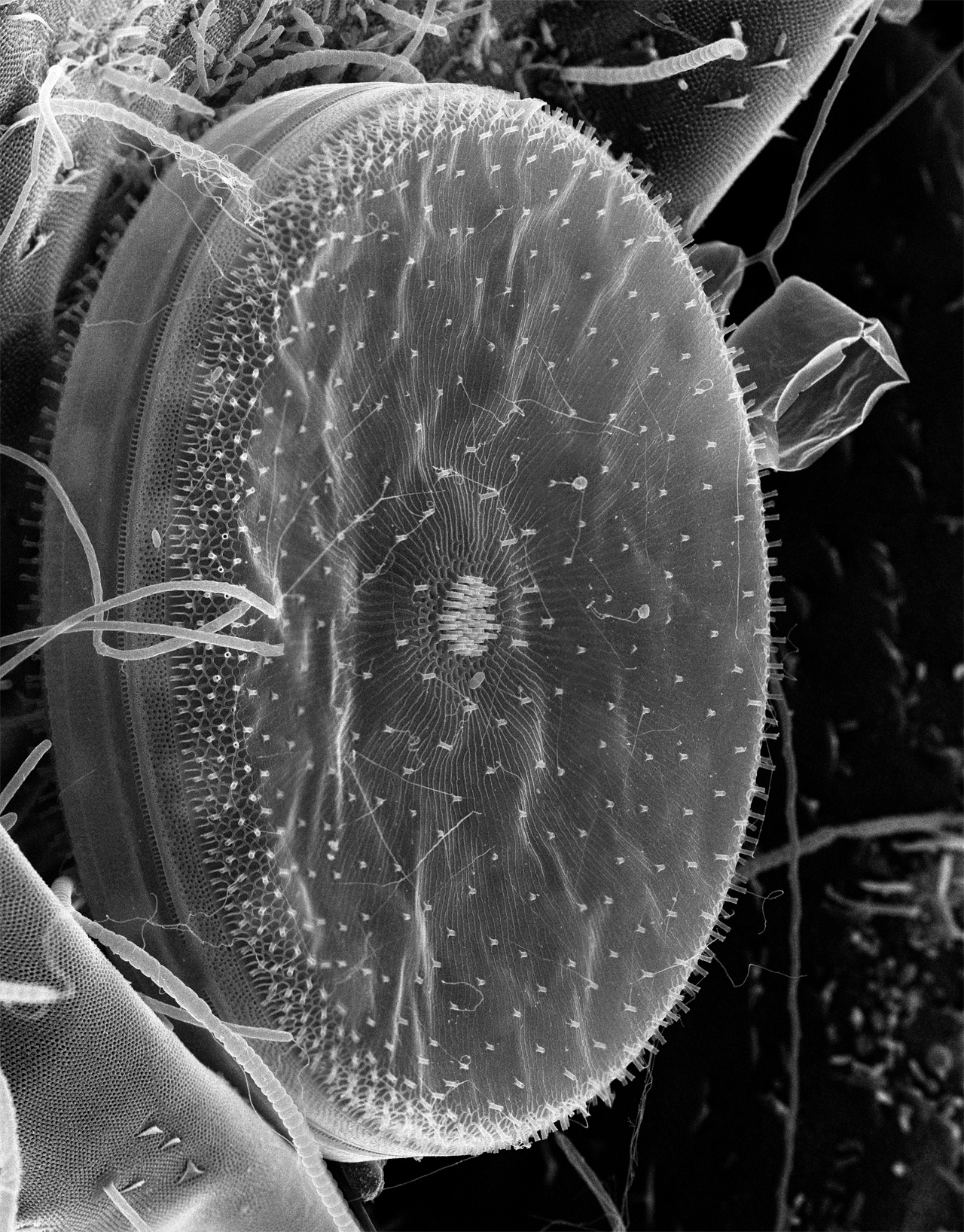 Scanning electron microscope images of a diatom; a type photosynthetic algae which builds an intricate glass shell, smaller than the width of a human hair.