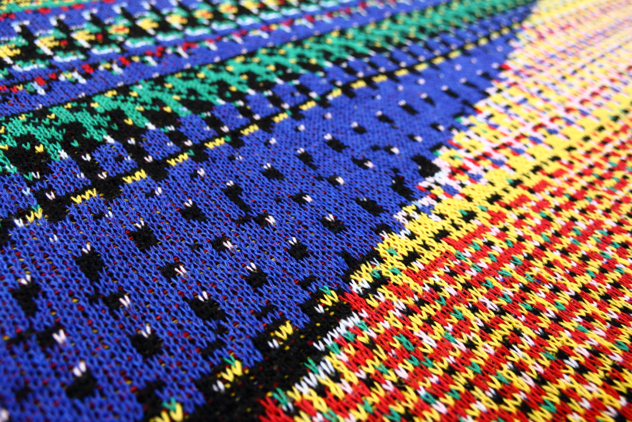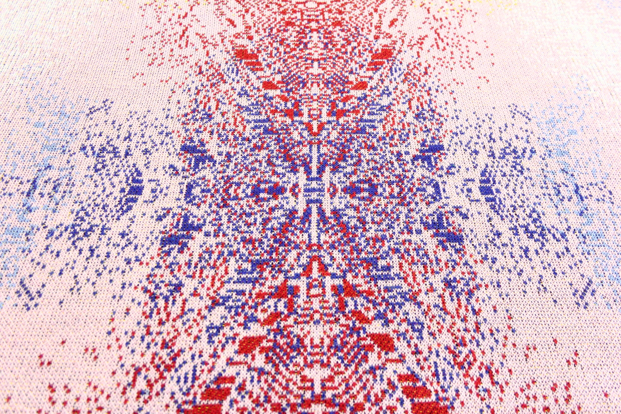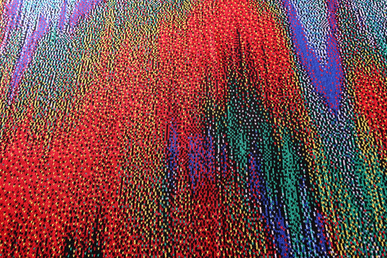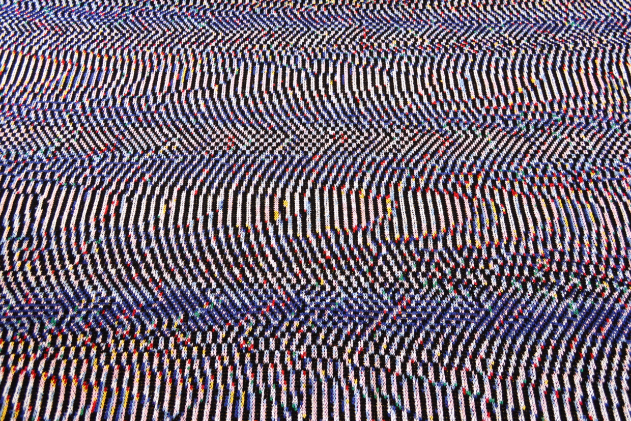 Phillip Stearns makes “knit wall hangings and blankets whose patterns are generated using images taken with short circuited cameras and other unorthodox digital techniques, including data visualization aided by the use of tools developed for digital forensics”. See more and buy his stuff at Glitch Textiles.
