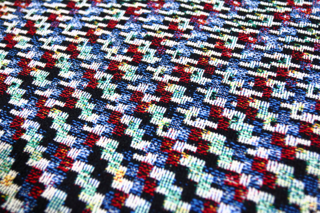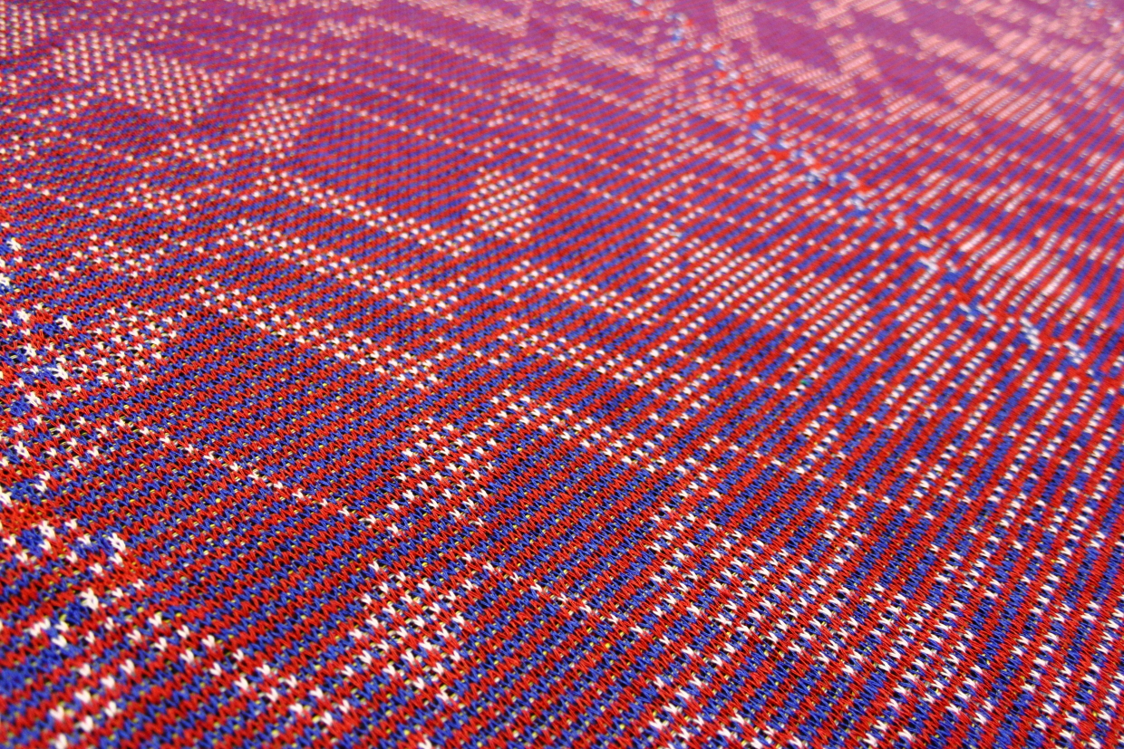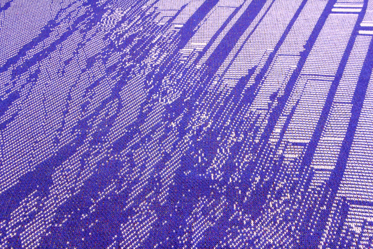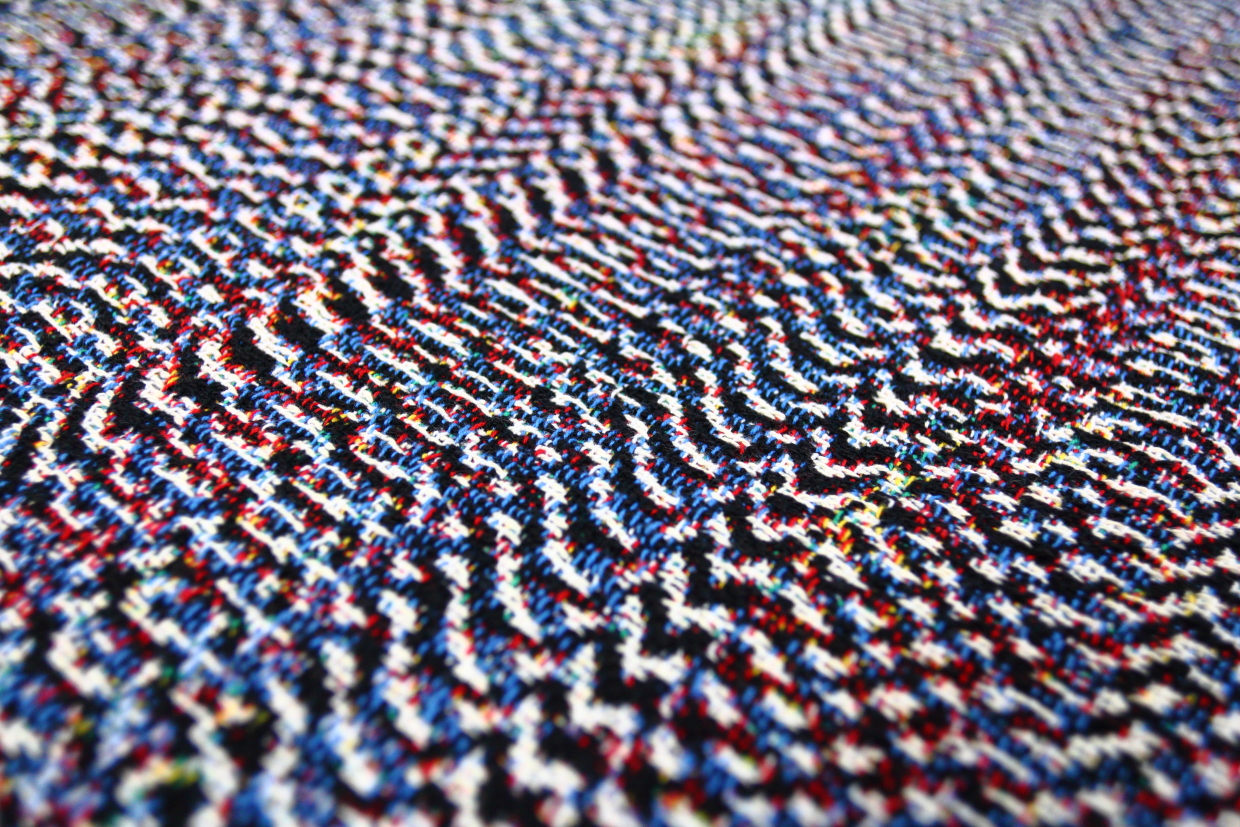 Phillip Stearns makes “knit wall hangings and blankets whose patterns are generated using images taken with short circuited cameras and other unorthodox digital techniques, including data visualization aided by the use of tools developed for digital forensics”. See more and buy his stuff at Glitch Textiles.