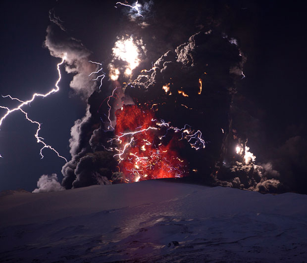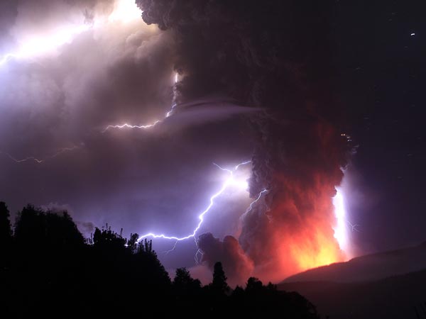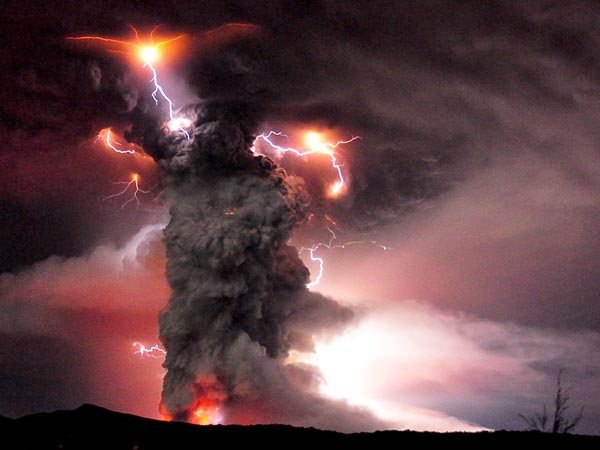 A dirty thunderstorm (also, Volcanic lightning) is a weather phenomenon that occurs when lightning is produced in a volcanic plume. A study in the journal Science indicated that electrical charges are generated when rock fragments, ash, and ice particles in a volcanic plume collide and produce static charges, just as ice particles collide in regular thunderstorms.