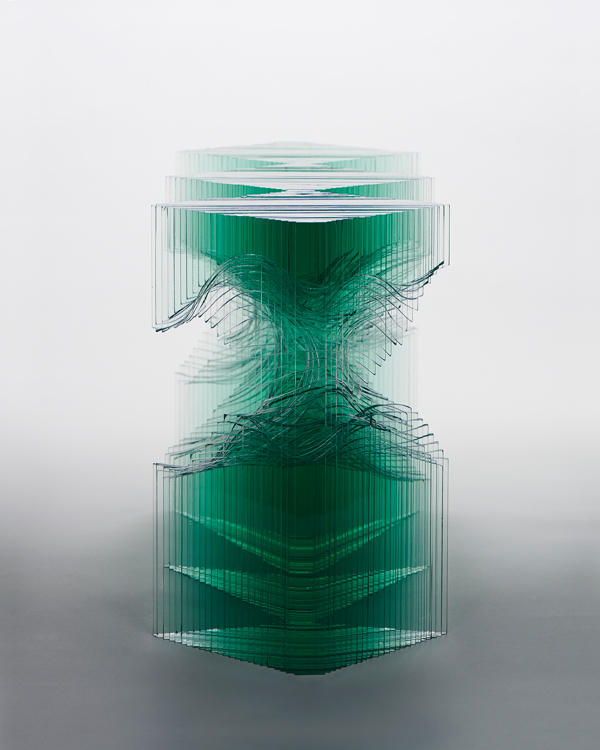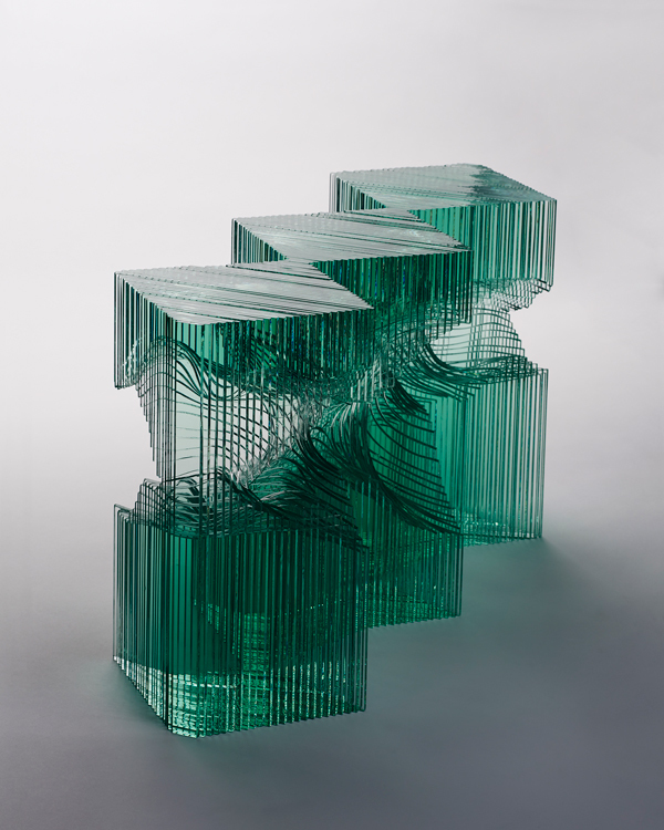 “I work with 2D shapes and have to figure out how to translate that into a 3D finished product. Sometimes my start point changes dramatically as shapes can be limited – I can’t create any internal right angles – so I have to find a way to layer the glass to create certain shapes.” (text from brokenliquid.com)