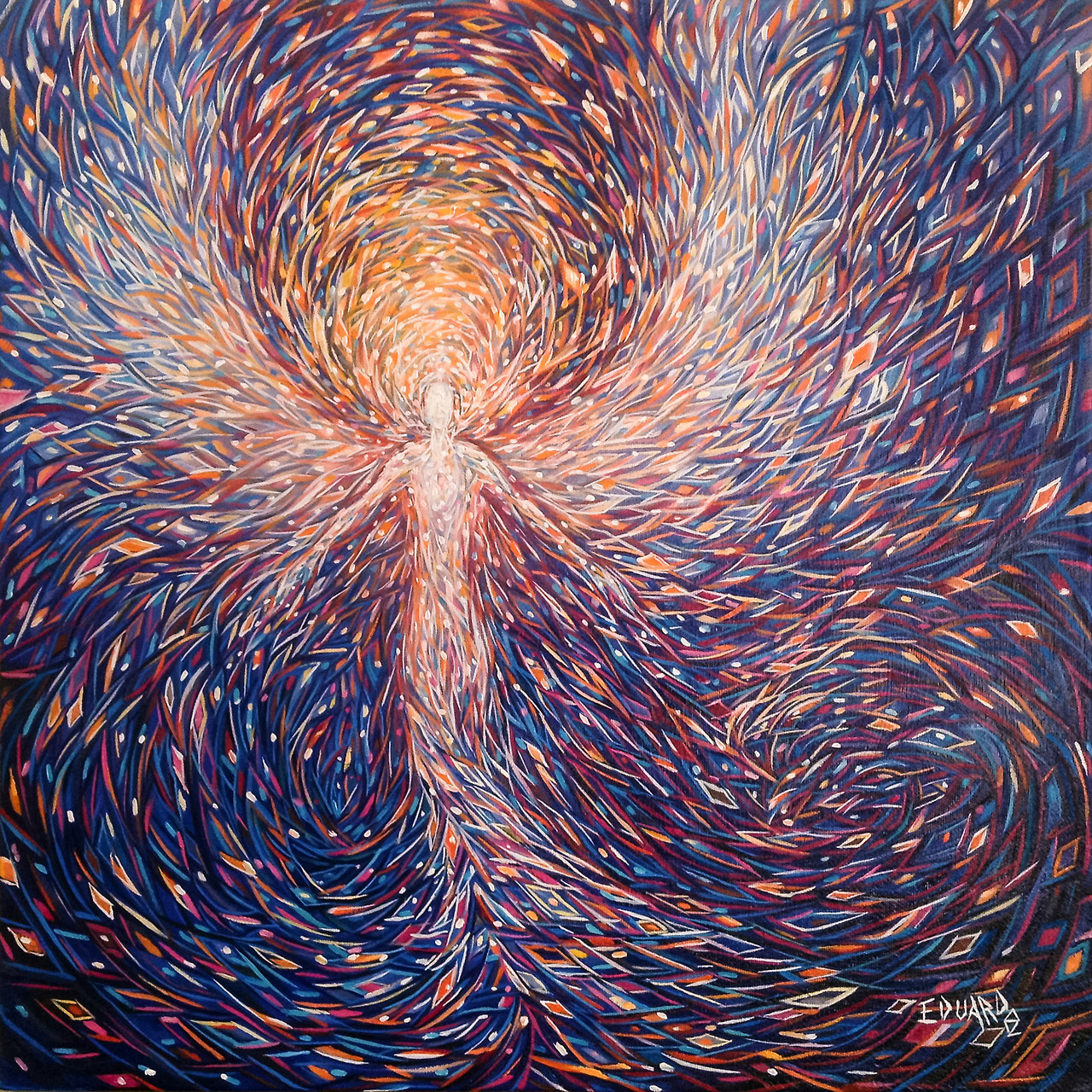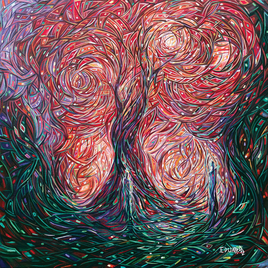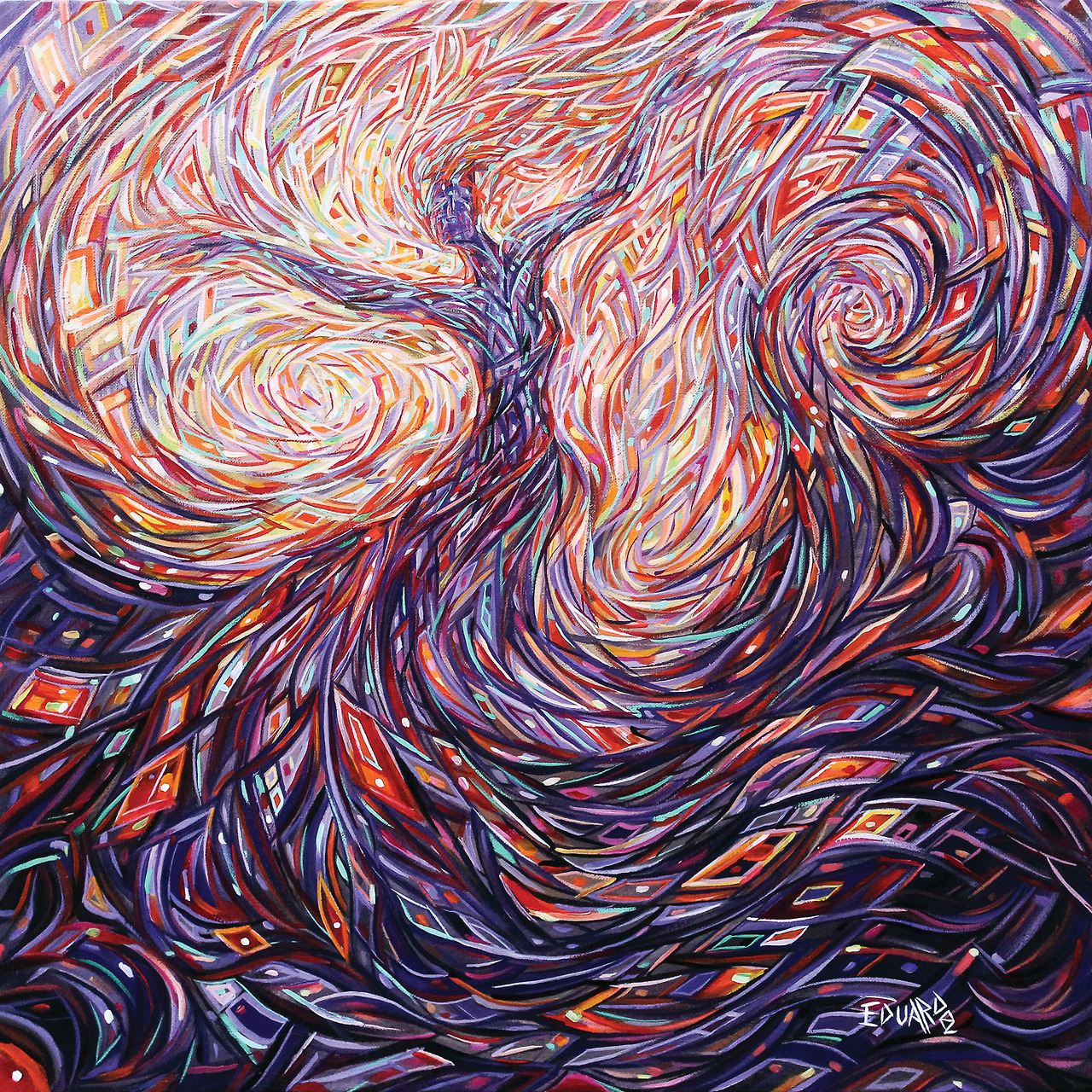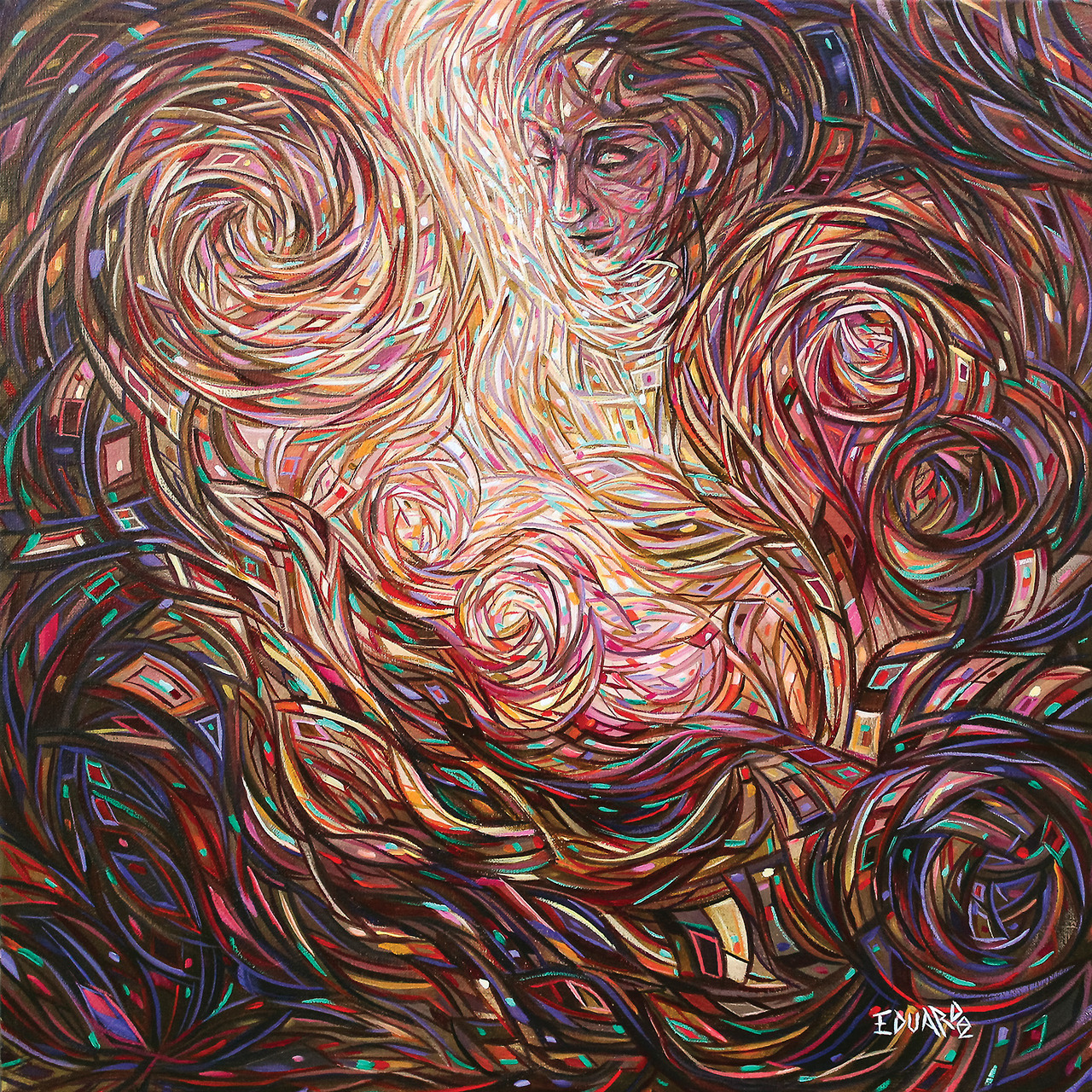 The artist and painter Eduardo Rodriguez Calzado describes himself as being obsessed with detail, “expressing emotions through the fragmentation of color”. While the human form or elements of human consciousness are often represented in his pieces, he also enjoys starting with more abstract gestures and colors, and letting the narrative unfold organically.
