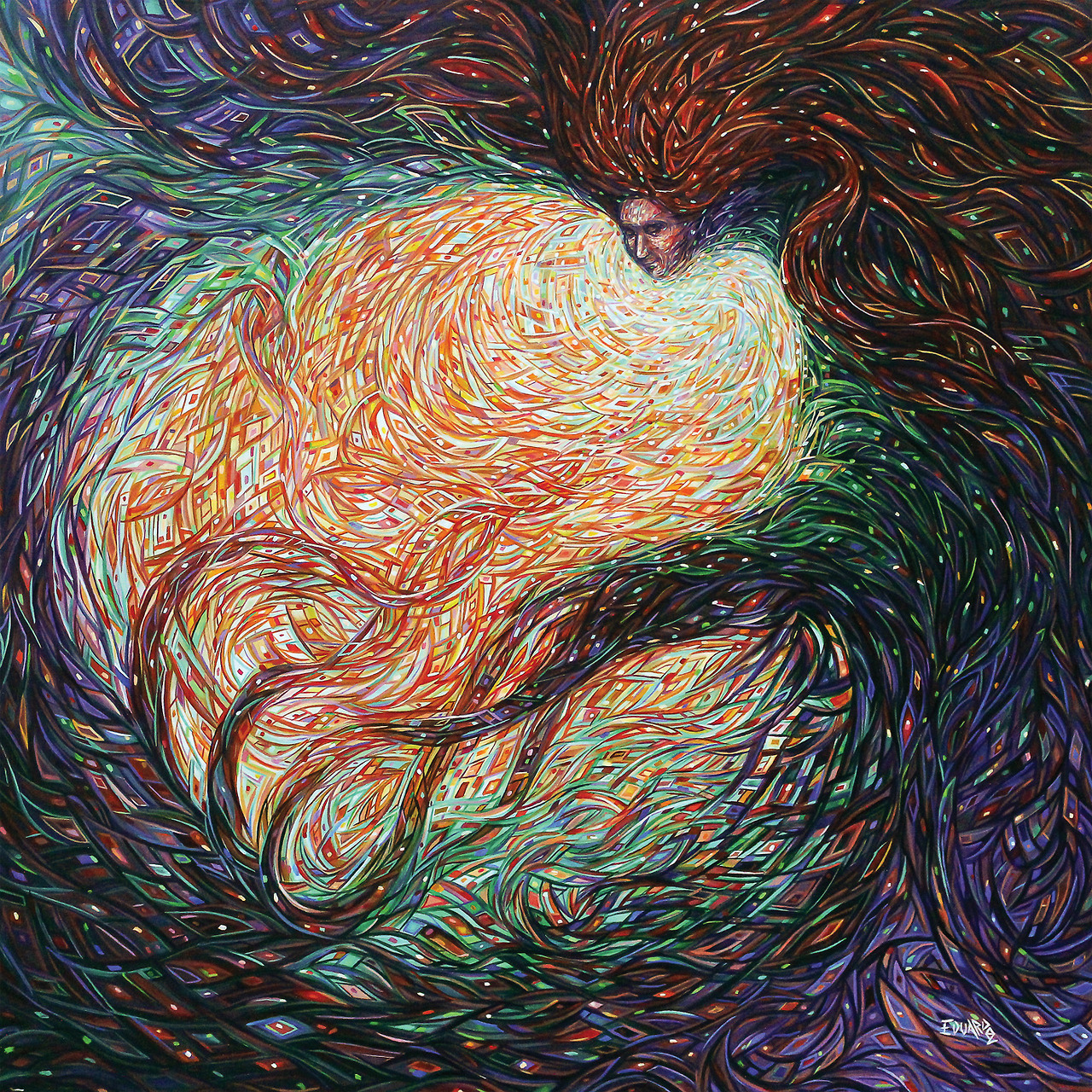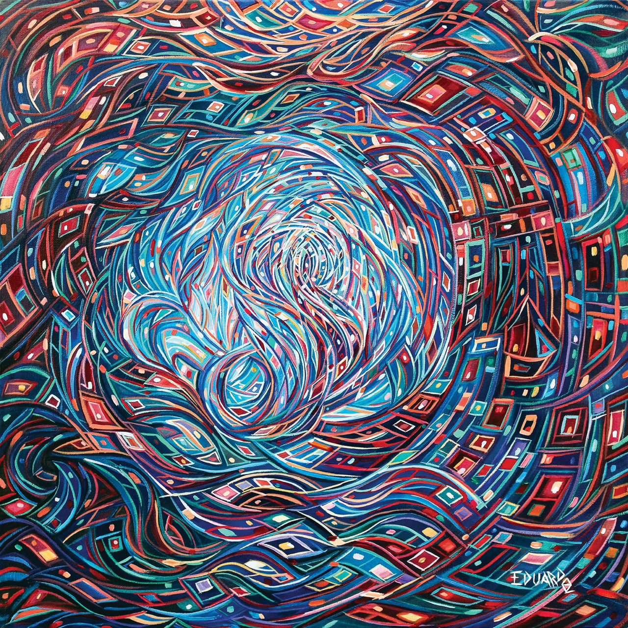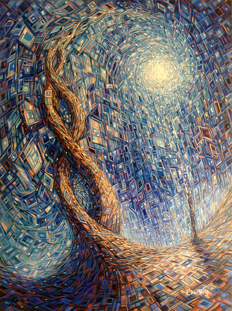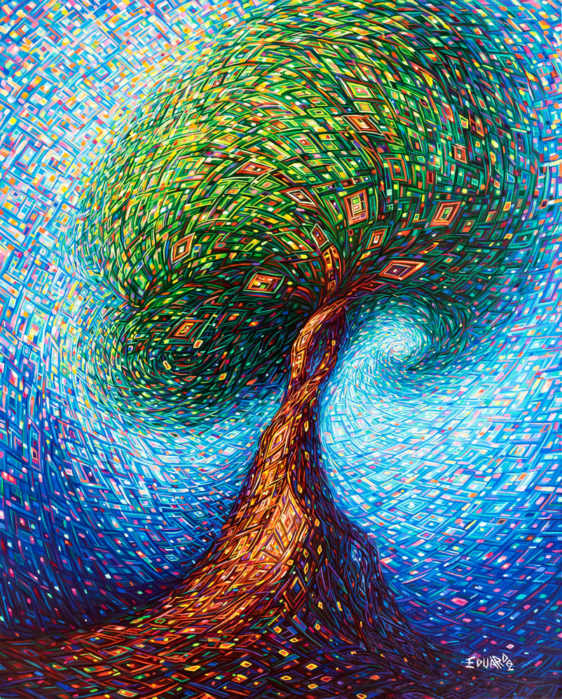 The artist and painter Eduardo Rodriguez Calzado describes himself as being obsessed with detail, “expressing emotions through the fragmentation of color”. While the human form or elements of human consciousness are often represented in his pieces, he also enjoys starting with more abstract gestures and colors, and letting the narrative unfold organically.
