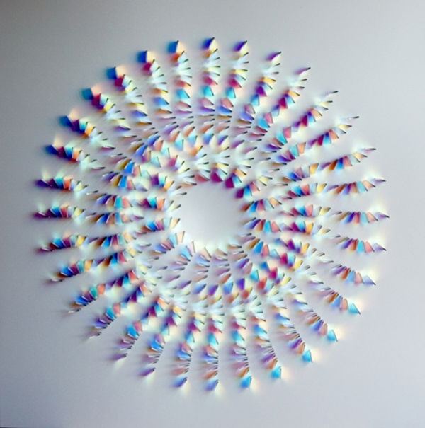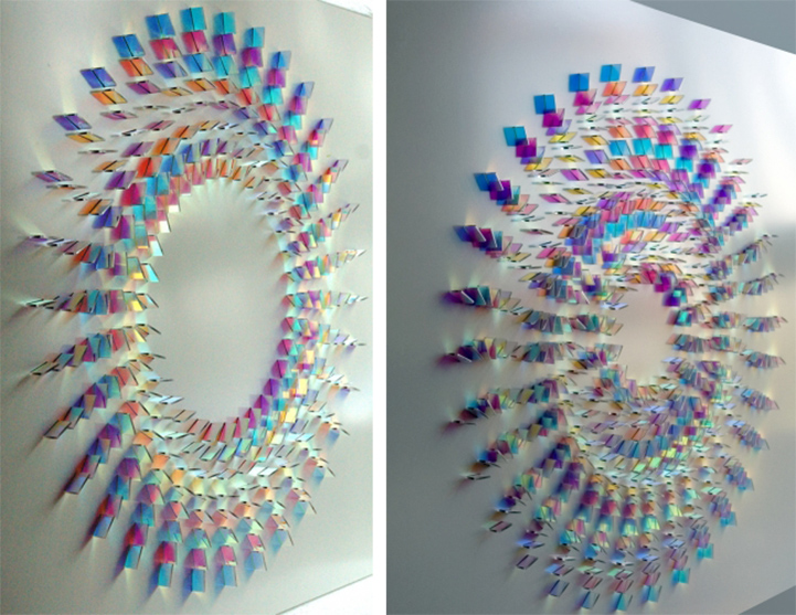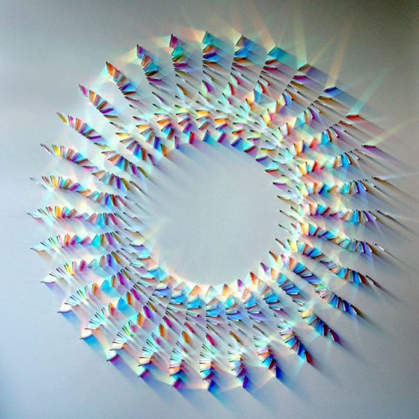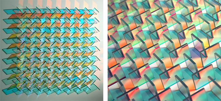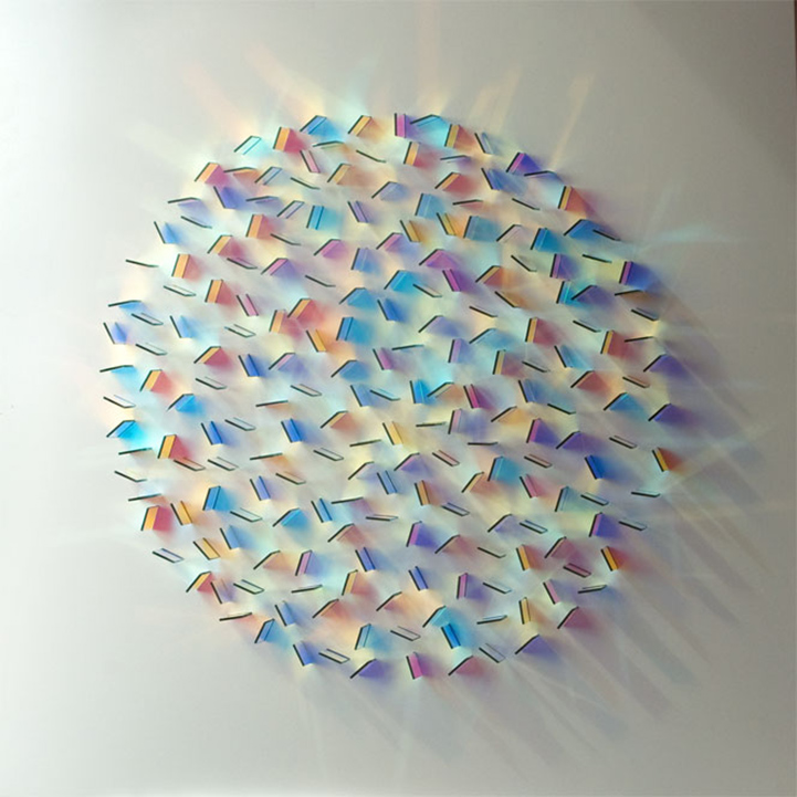 Cambridgeshire-based artist Chris Wood’s beautiful, geometric arrangements of colorful glass create dazzling reflections and projections of light.
