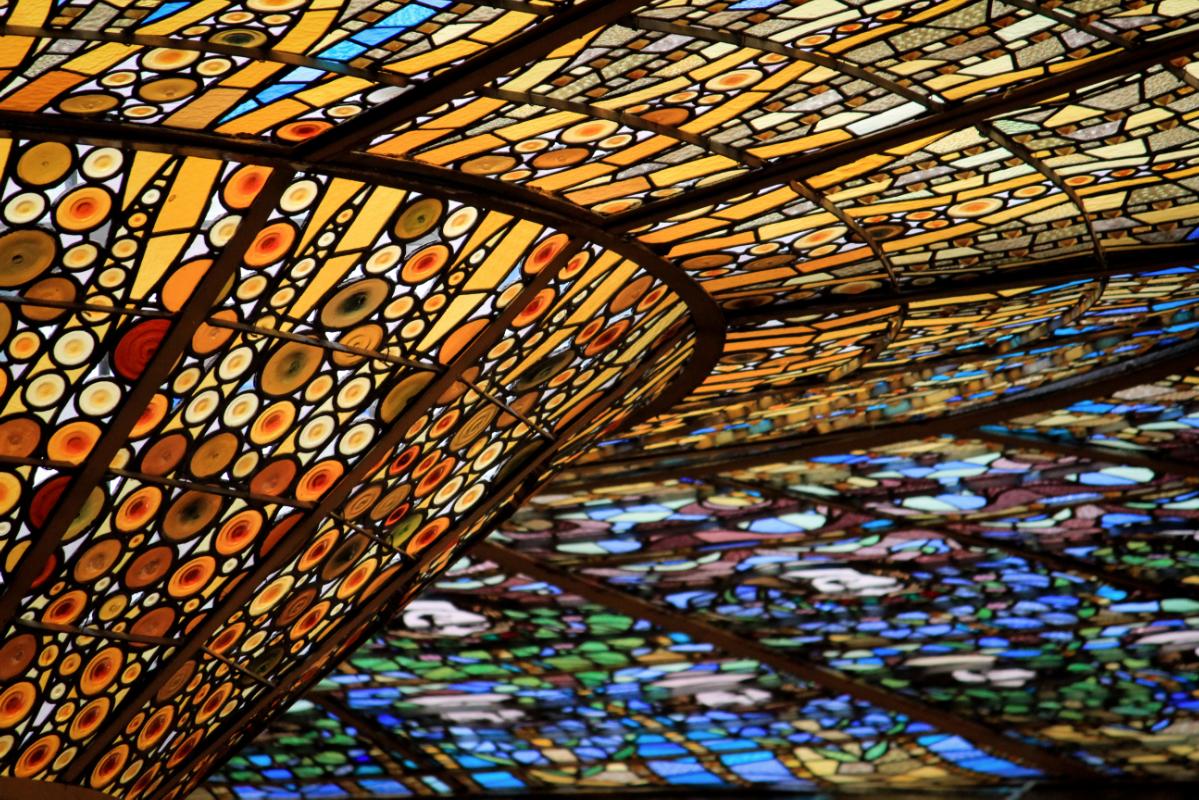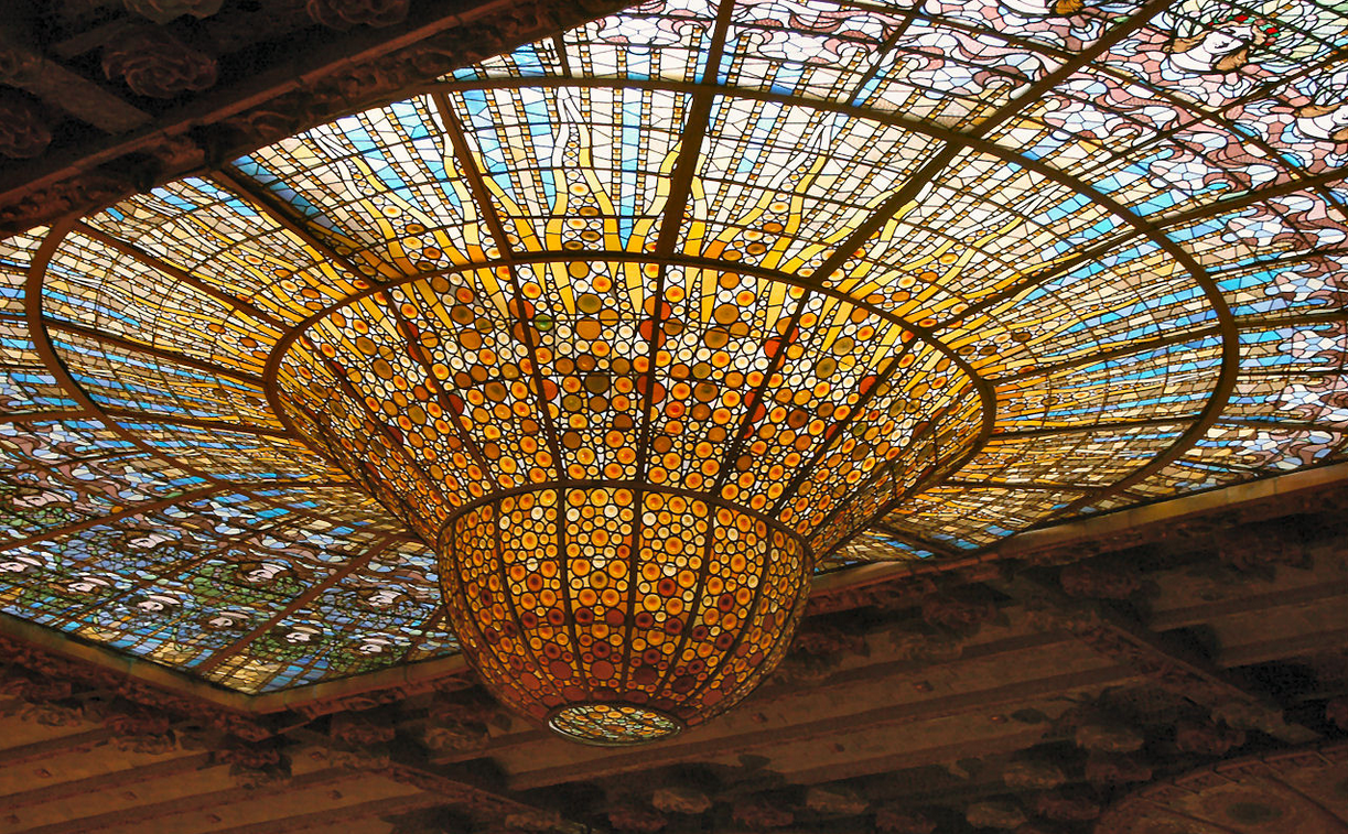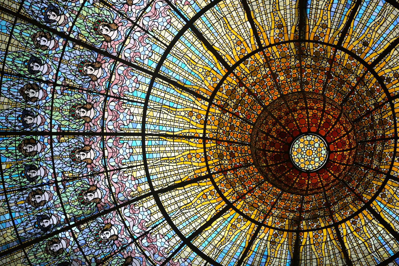 The inverted dome stained-glass ceiling at the Palau de la Música Catalana (Palace of Catalan Music) in Barcelona