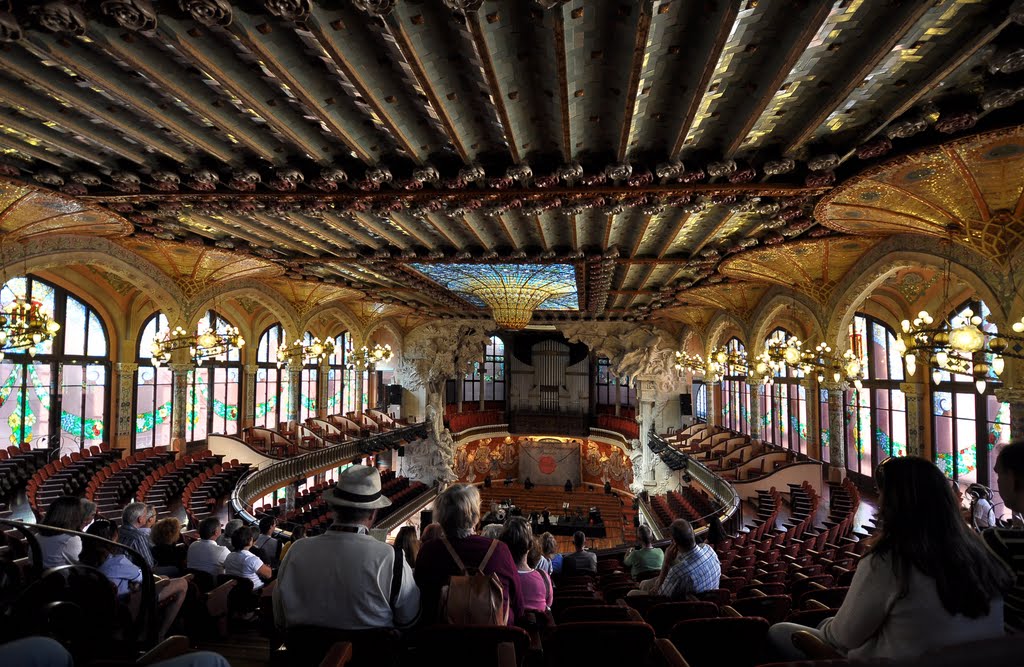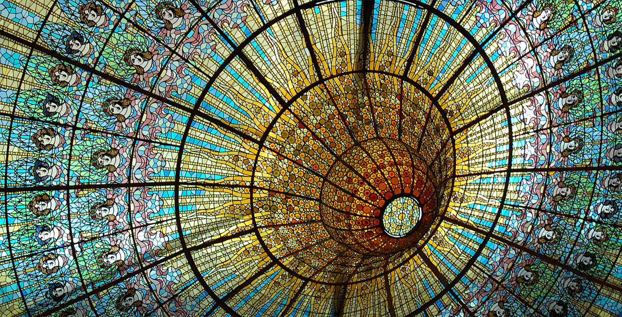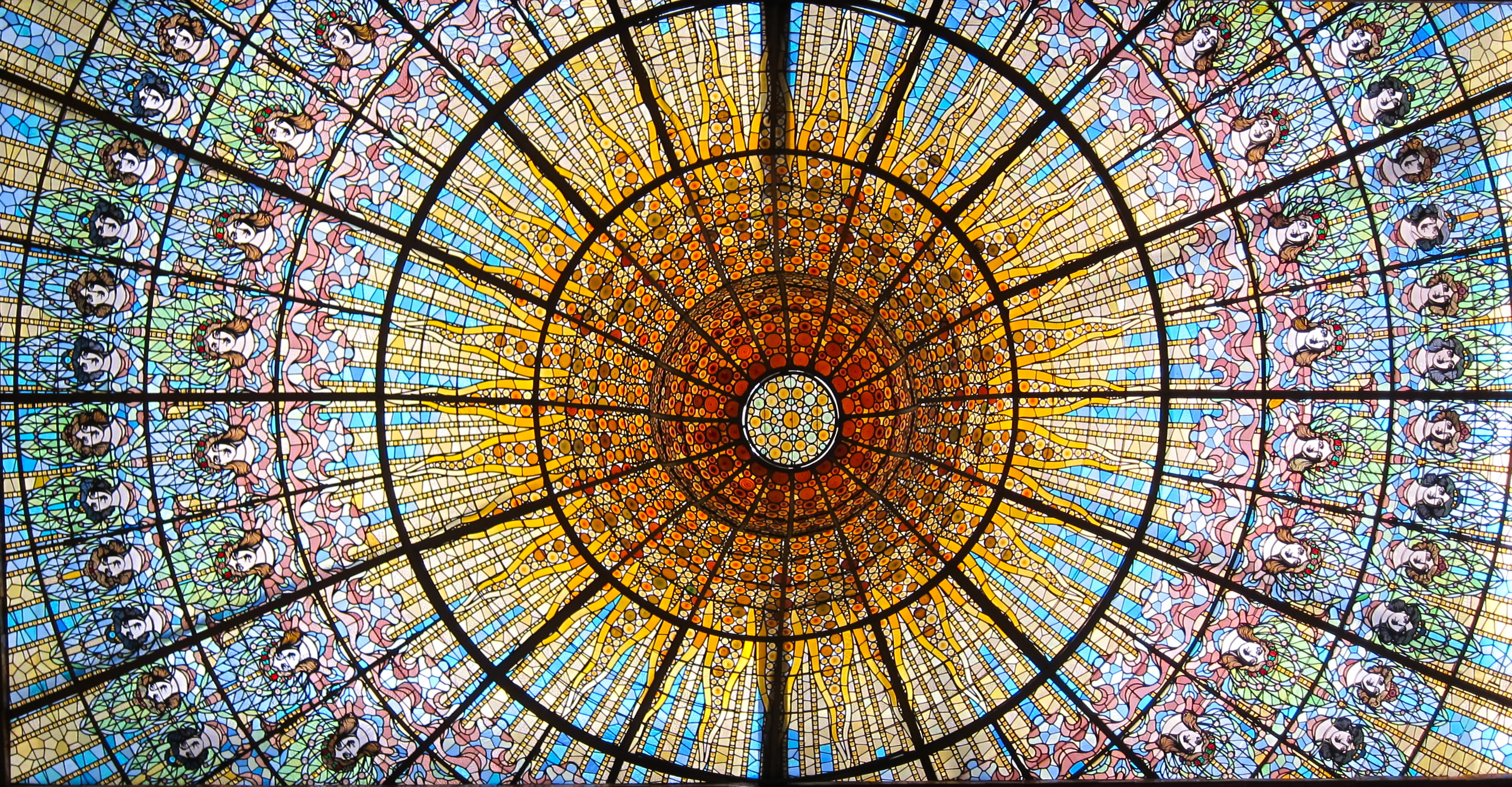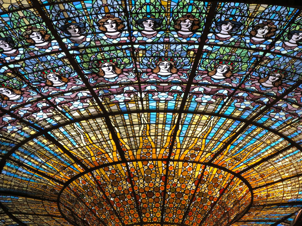 The inverted dome stained-glass ceiling at the Palau de la Música Catalana (Palace of Catalan Music) in Barcelona