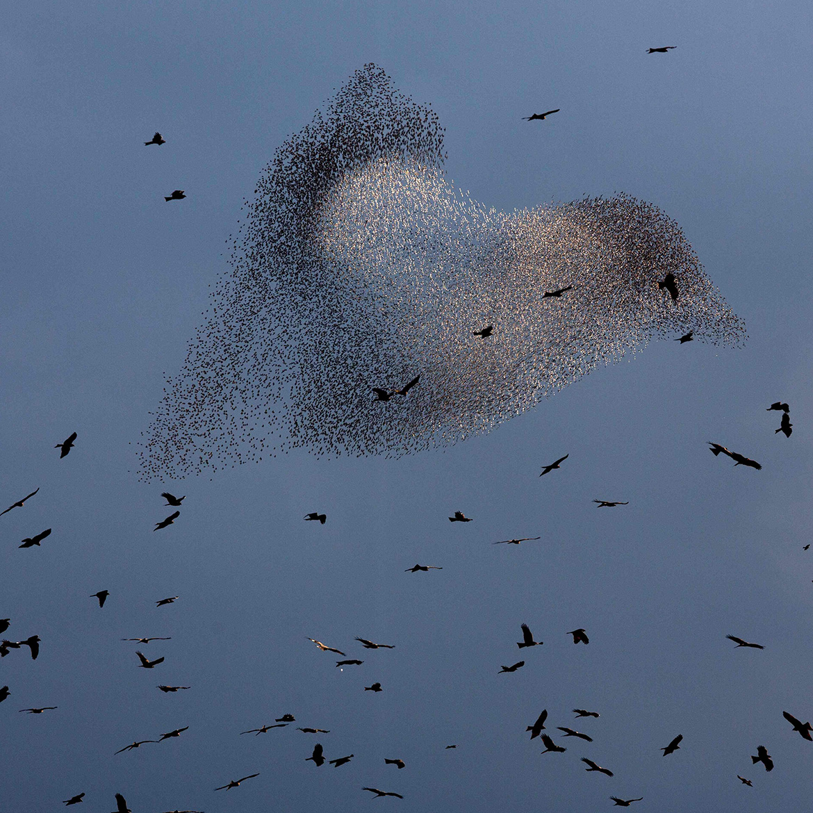 Black kites fly in the foreground, as a murmuration of starlings perform a spectacular aerial display on February 10th 2016, near the southern Israeli city of Rahat. Credit: AFP/Menahem Kahana