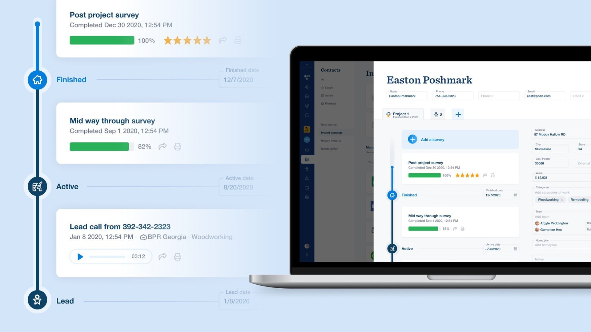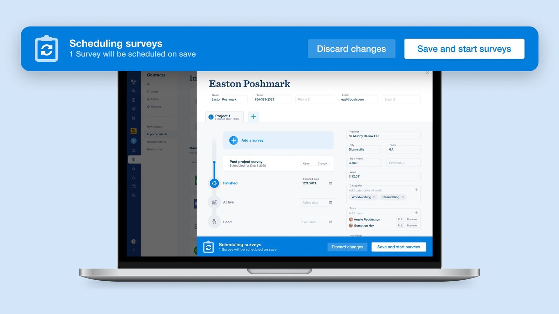 With many new leads in our system and more companies using GuildQuality to view results, we wanted to leverage their attention for upselling. We introduced full lifecycle tracking for projects, from lead to sold to completed. Although we already provided surveys for each project stage, we hadn't effectively promoted their use. To address this, we simplified the process for leads to update their status to sold or completed, automatically initiating the relevant survey. Additionally, we revamped the project screen to streamline progress tracking.