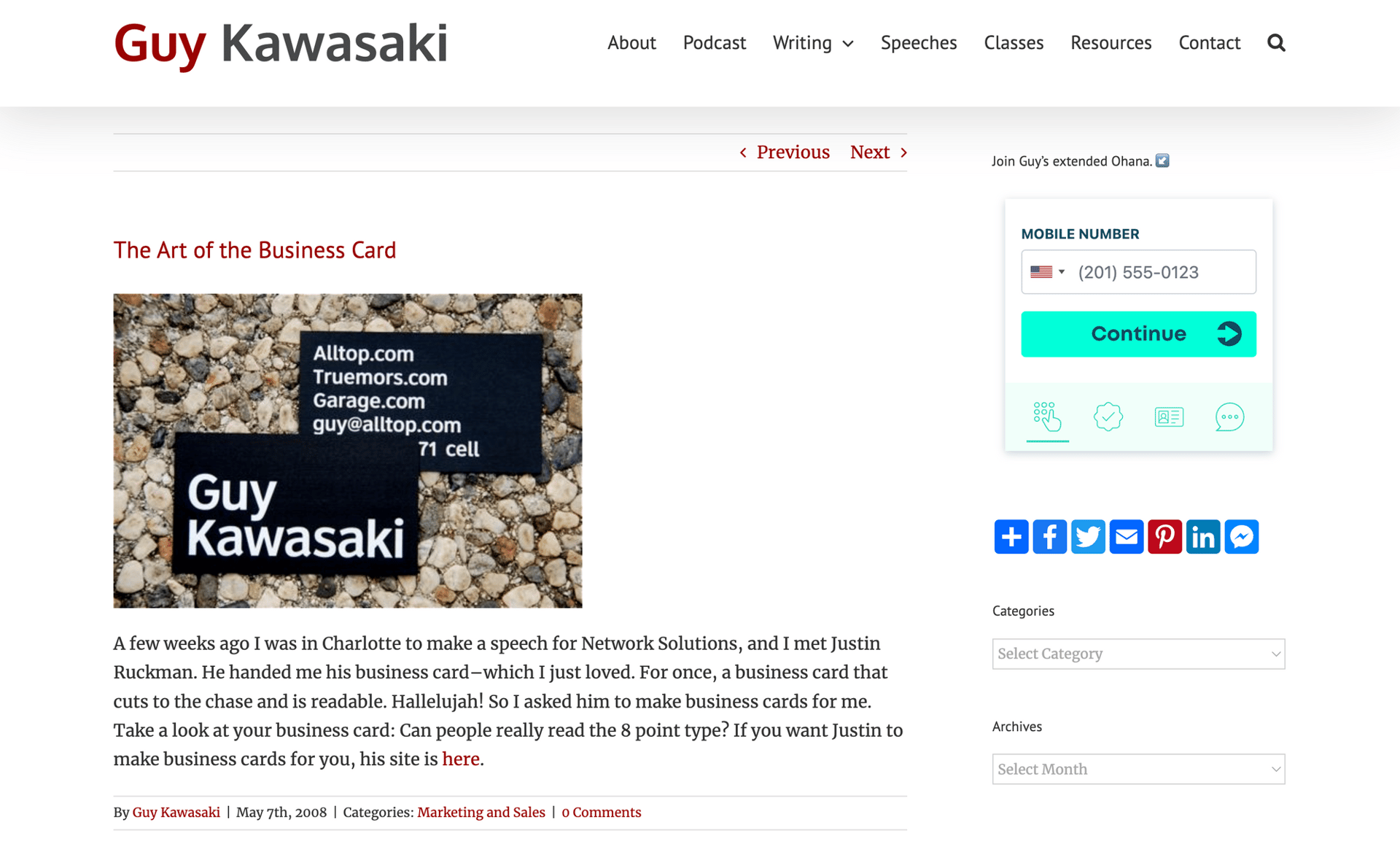 At one point I attended a dinner event featuring Guy Kawasaki, a fairly legendary Silicon Valley figure and one of Apple's early marketers. I handed him my card in conversation and he liked it so much, he asked if I could make him some.