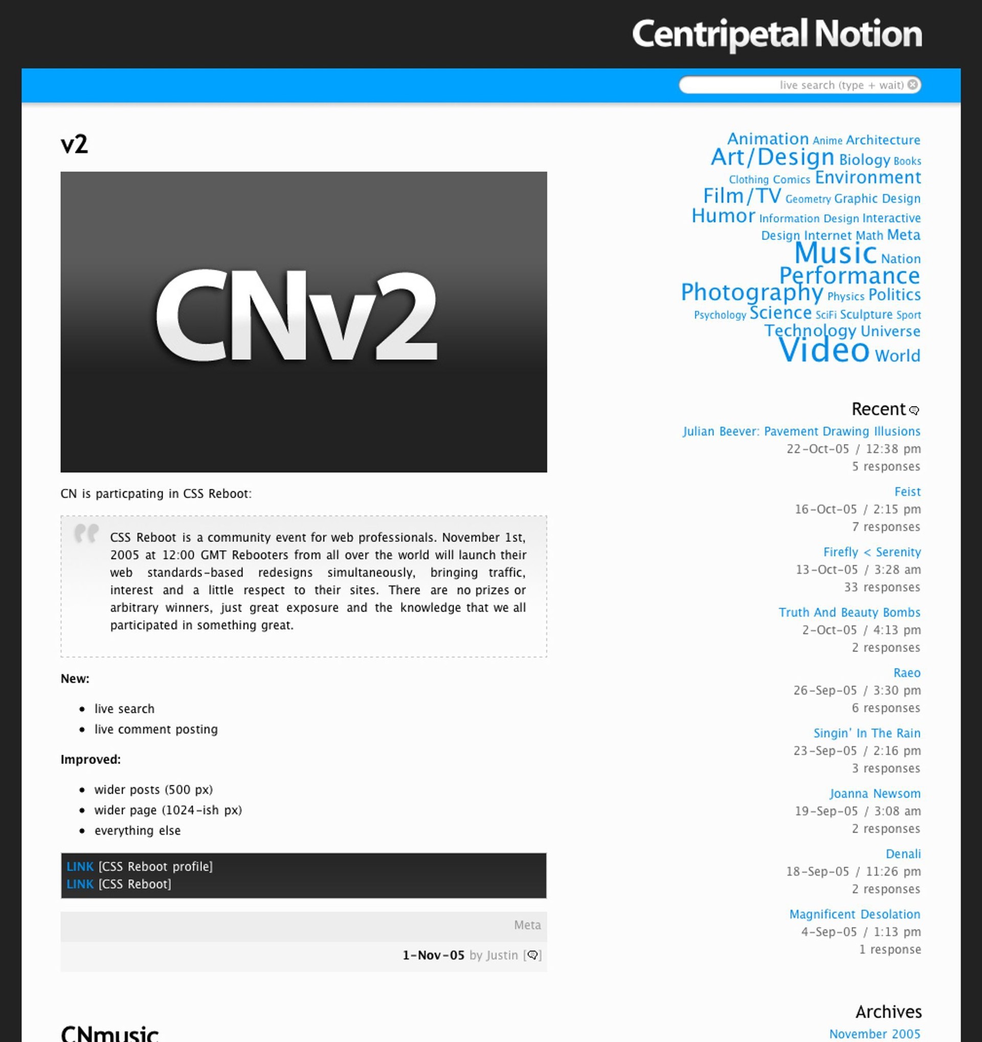 I started my first blog as "Centripetal Notion" in 2004, a name I thought was terrifically clever at the time. I can't find a screenshot of the original site, but I did find one for my redesign a year later.